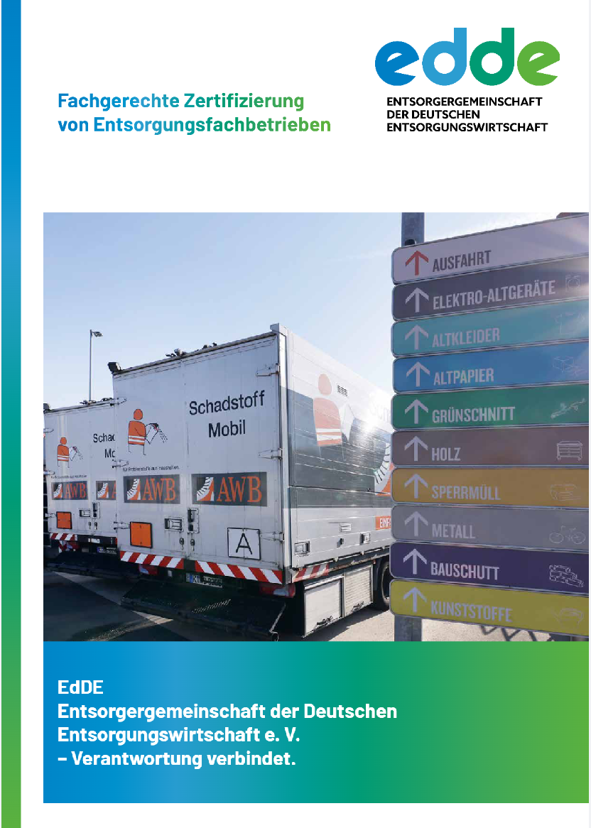 Die EdDE erteilt ihre Zertifikate zum Entsorgungsfachbetrieb gemäß der Berichte der vor-Ort eingesetzten unabhängigen Sachverständigen mit anschließender Qualitätskontrolle durch die EdDE-Geschäftsstelle. Die EdDE gibt einheitliche Prüfdokumente vor, schult und begleitet die bei ihr akkreditierten Sachverständigen. So werden Zertifikate höchster Qualität und Verlässlichkeit erzielt. Das Qualitätsmanagement der EdDE ist zertifiziert nach DIN EN ISO 9001.
